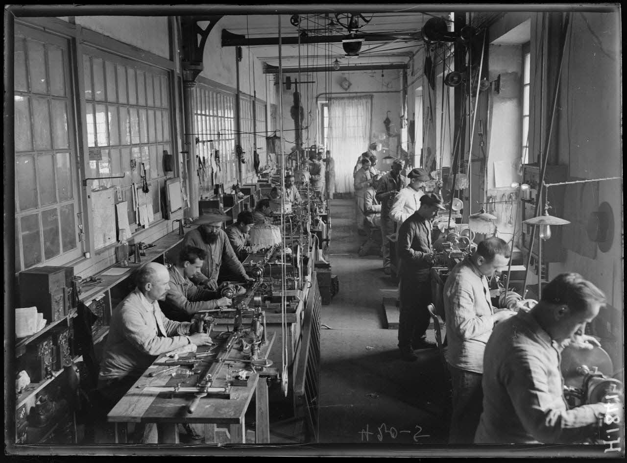 Dans l'atelier du Mourillon, une hélice de 6000 kg est ajustée sur un arbre à hélices. Une quille sert de support à l'arbre porte-hélices. Non loin d'une cale de construction, le "Regnault" est parqué sans son ballast. Des apprentis mécaniciens aident à l'ajustage et au contrôle des équipements et de l'armement. Une presse hydraulique sert à la coulée de bâtis d'obus. Les essais sur les obus sont effectués à 1400 kgn le culot est poinçonné à 30 tonnes, après le décapage et le graissage des munitions. Un contrôle géométrique des obus de 75 mm est réalisé.