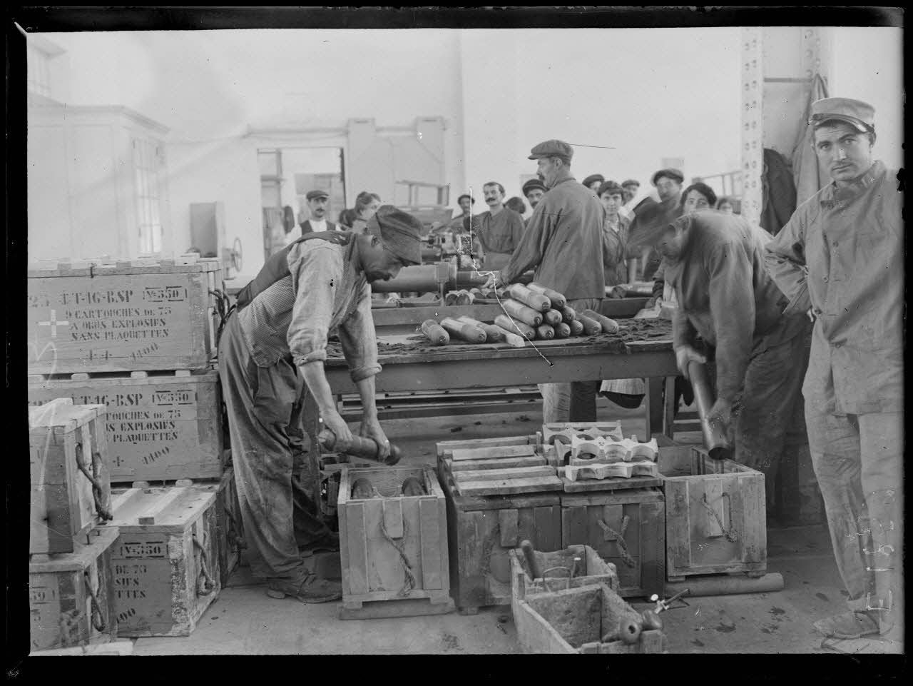 Toulon. Bâtiment de la Pyrotechnie. Bat. 44. Calibrage et encaissement de l'obus de 75. [légende d'origine]