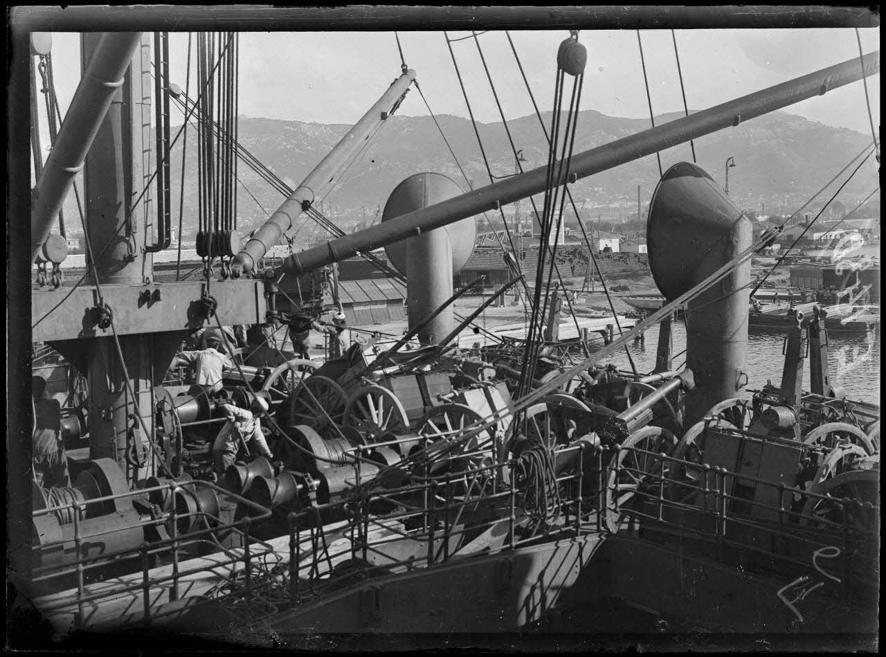 Toulon. Chargement du croiseur auxiliaire Sant'Anna avant son départ pour Salonique. Les pièces de 75 à bord. [légende d'origine]