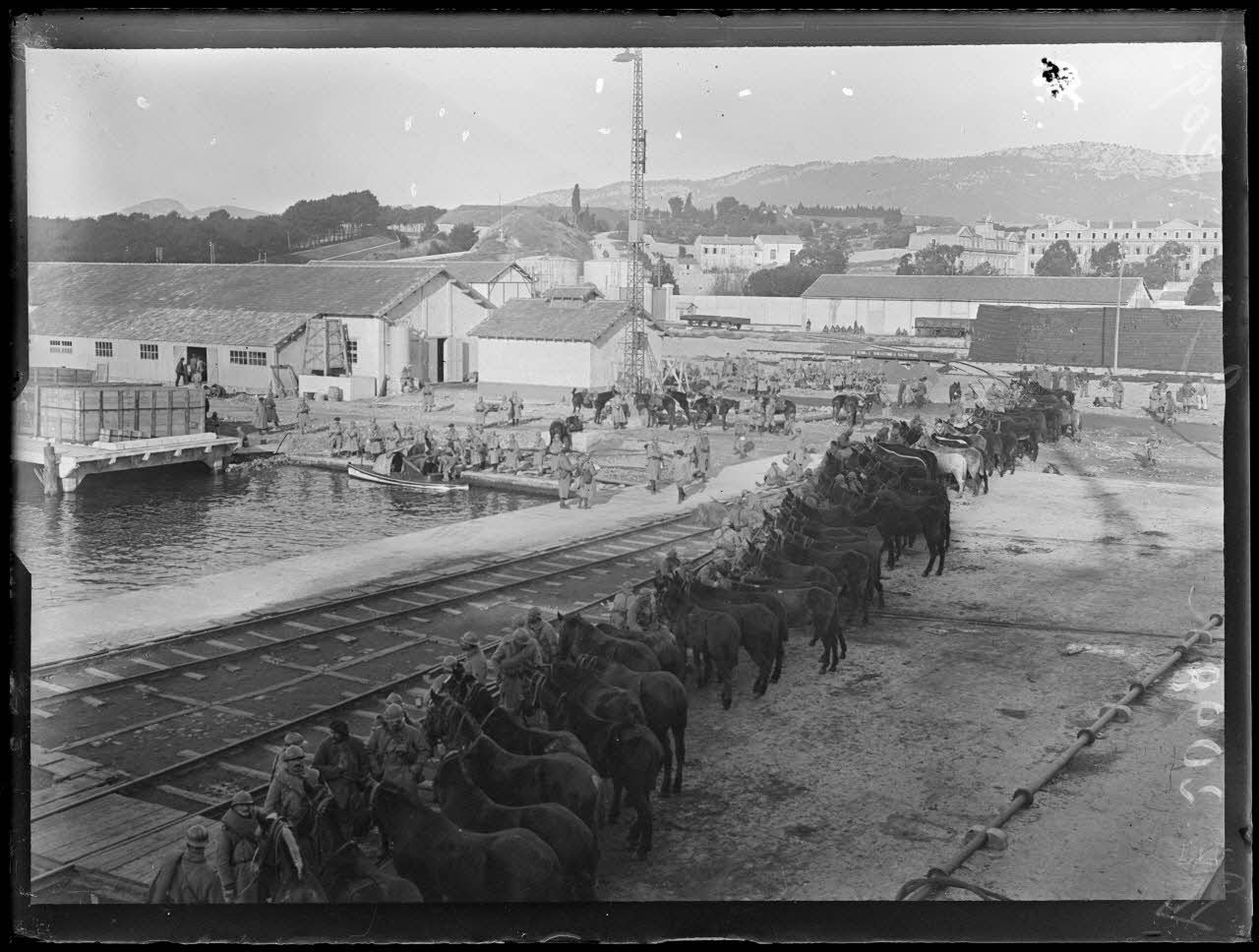 Toulon. Dans le port. Chevaux prêts à être embarqués sur un croiseur auxiliaire pour Salonique. [légende d'origine]