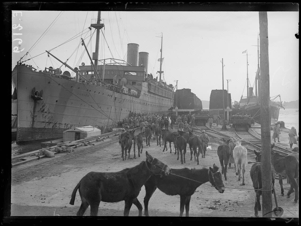 Toulon. Dans le port. Chevaux prêts à être embarqués sur un croiseur auxiliaire pour Salonique.