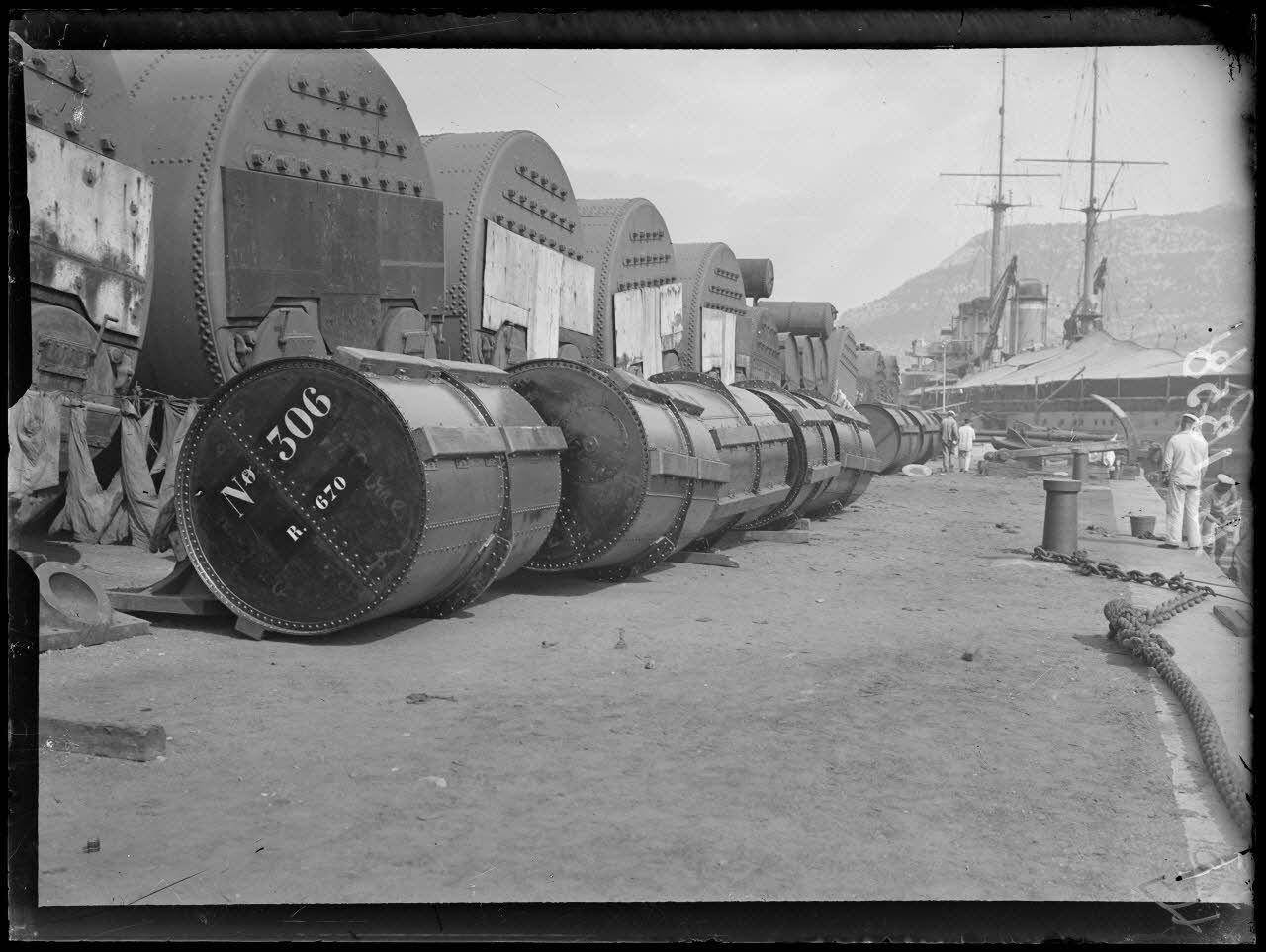 Toulon. A l'arsenal. Déchargement de chaînes servant aux lignes pour la construction de filets d'acier contre les sous-marins.