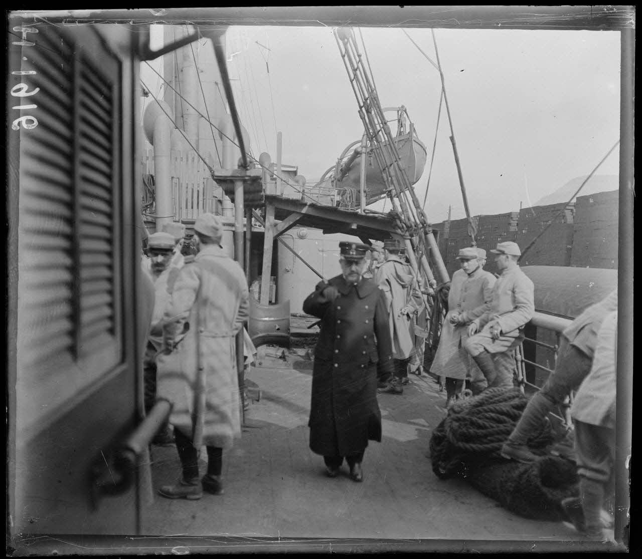 A bord de l'Algérie, soldats français et serbes munis de ceintures de sauvetage.