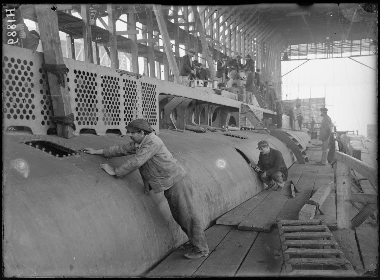 Dans l'atelier du Mourillon, une hélice de 6000 kg est ajustée sur un arbre à hélices. Une quille sert de support à l'arbre porte-hélices. Non loin d'une cale de construction, le "Regnault" est parqué sans son ballast. Des apprentis mécaniciens aident à l'ajustage et au contrôle des équipements et de l'armement. Une presse hydraulique sert à la coulée de bâtis d'obus. Les essais sur les obus sont effectués à 1400 kgn le culot est poinçonné à 30 tonnes, après le décapage et le graissage des munitions. Un contrôle géométrique des obus de 75 mm est réalisé.