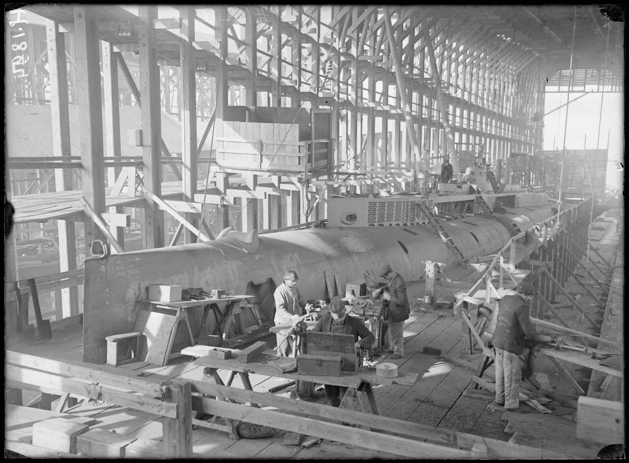 Dans l'atelier du Mourillon, une hélice de 6000 kg est ajustée sur un arbre à hélices. Une quille sert de support à l'arbre porte-hélices. Non loin d'une cale de construction, le "Regnault" est parqué sans son ballast. Des apprentis mécaniciens aident à l'ajustage et au contrôle des équipements et de l'armement. Une presse hydraulique sert à la coulée de bâtis d'obus. Les essais sur les obus sont effectués à 1400 kgn le culot est poinçonné à 30 tonnes, après le décapage et le graissage des munitions. Un contrôle géométrique des obus de 75 mm est réalisé.