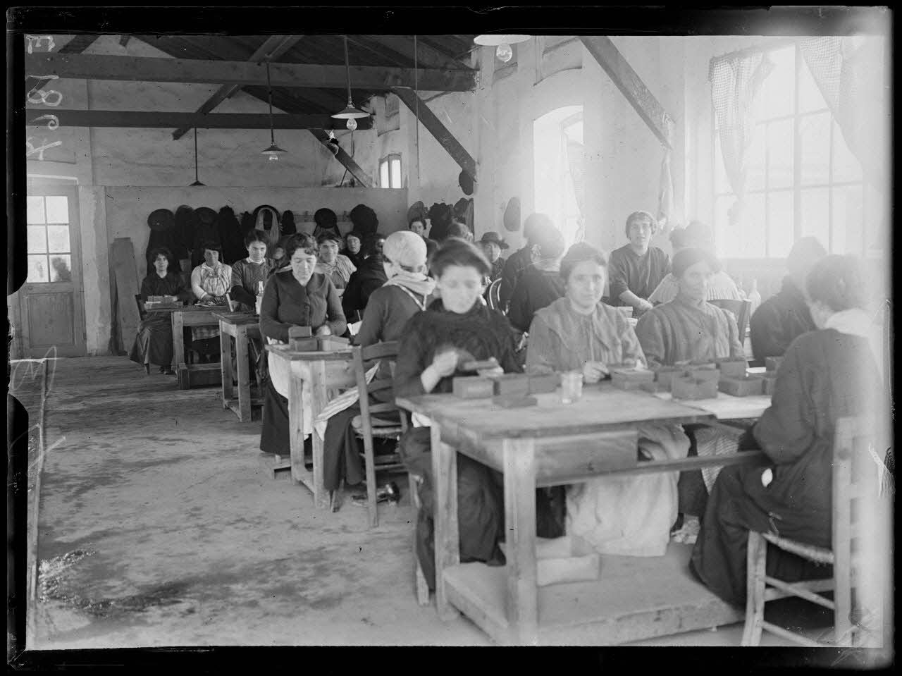 Toulon. pyrotechnie. Bâtiment 47 bis. Découpage des rondelles de feutre pour fusées de 75.