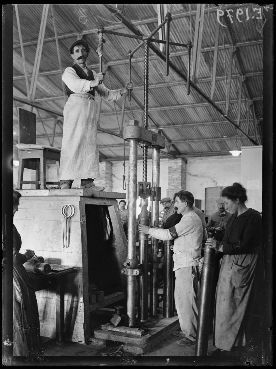 Toulon. Pyrotechnie. Batiment 56. Mise en place de l'obus sur douille de 100. [légende d'origine]