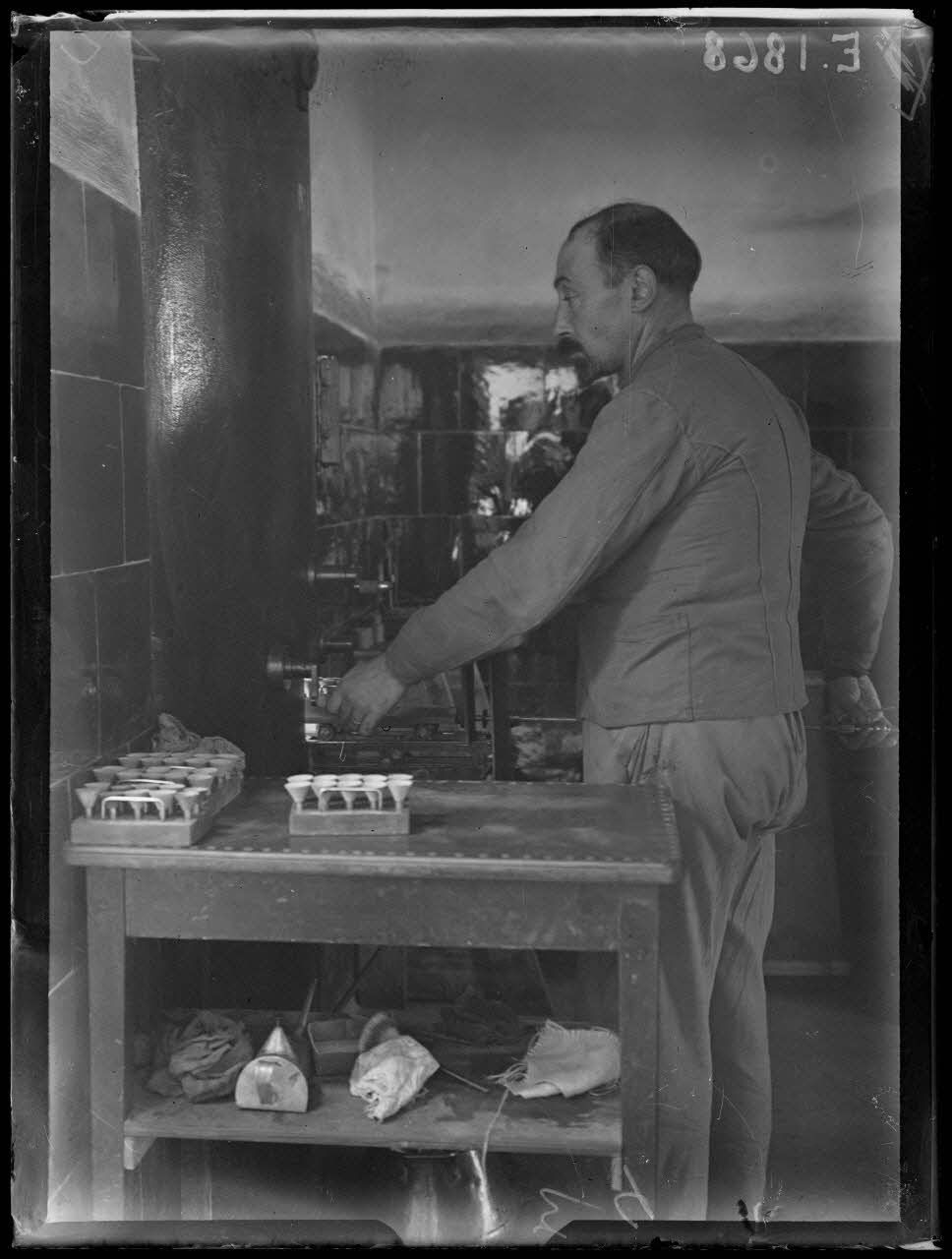 Toulon. Bâtiment de la Pyrotechnie. Bat. 44. Mise en place de l'obus de 75 sur la douille.