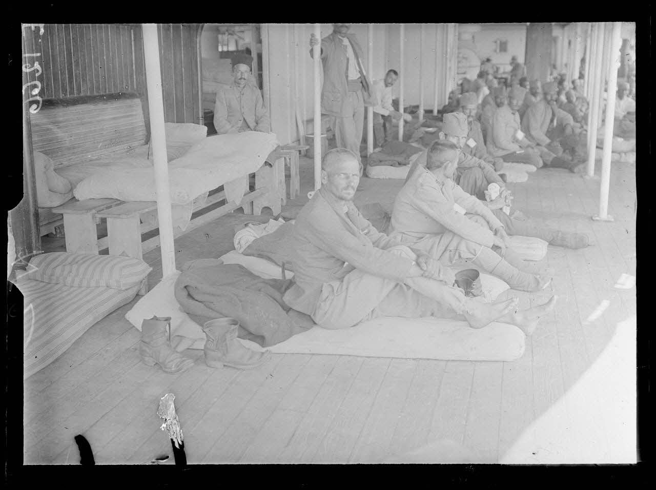 Toulon. Navire hôpital La France. Malades transportés du navire hôpital La France sur le remorqueur l'hirondelle.
