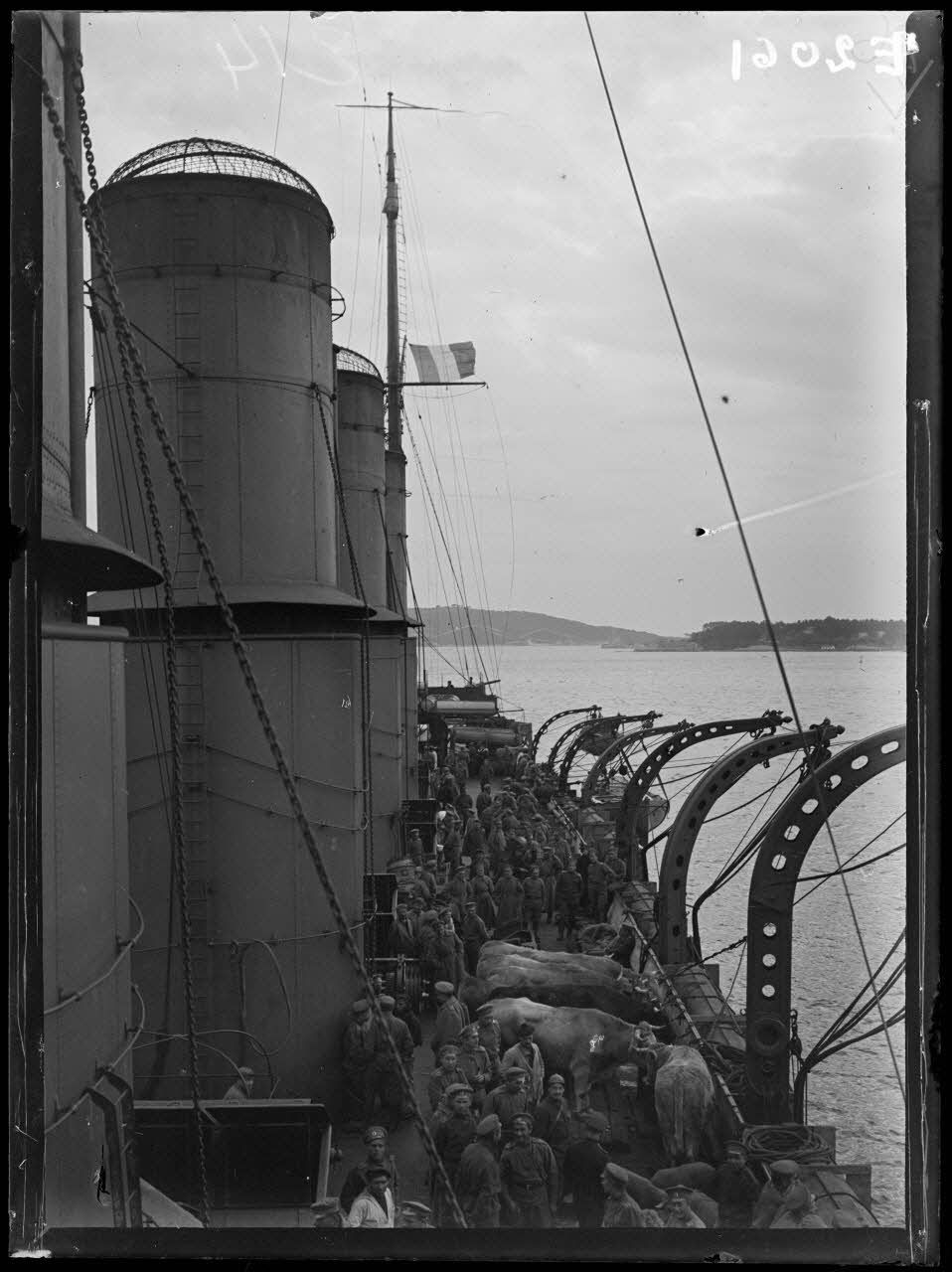 Des troupes coloniales arrivent en train sur le port et embarquent pour le Pirée. D'autres troupes coloniales et des soldats russes, serbes et français embarquent pour Salonique.