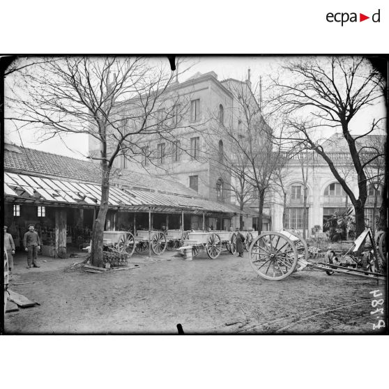 Dans la cour de l'usine des caissons à munitions pour mitrailleurs sont montés sur des charrettes.