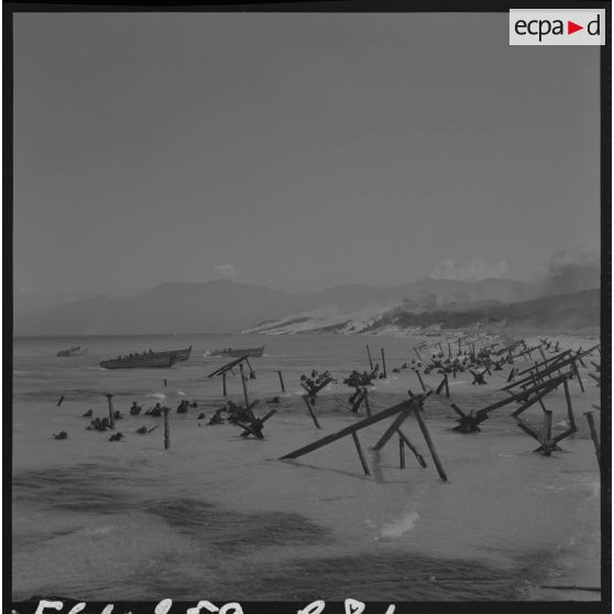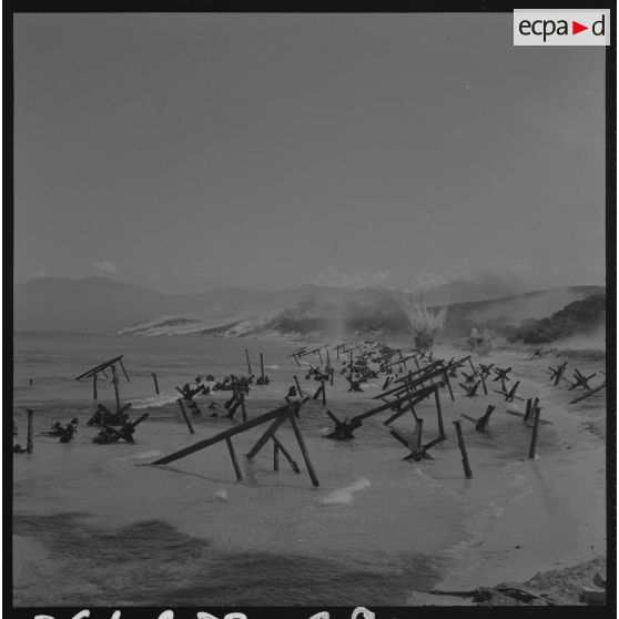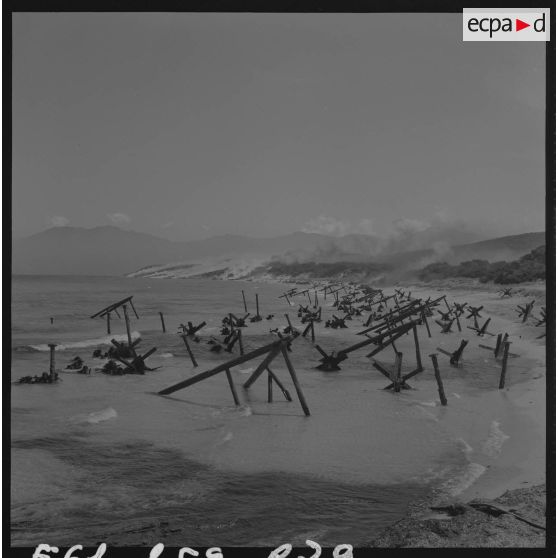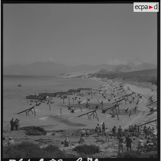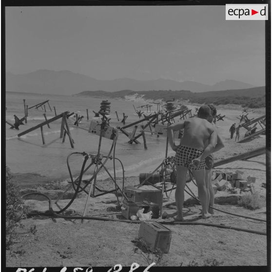 Sur le tournage du film Le jour le plus long. Vue d'ensemble de la plage de Saleccia.