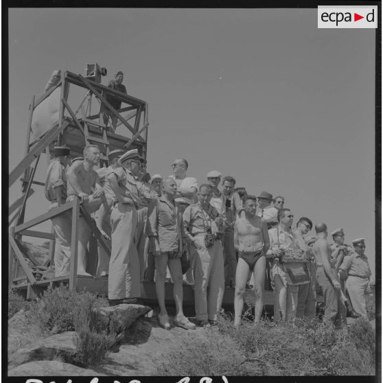 Sur le tournage du film Le jour le plus long. Tribune officielle pendant les exercices de débarquement. Au premier plan : Darryl Zanuck, producteur du film.