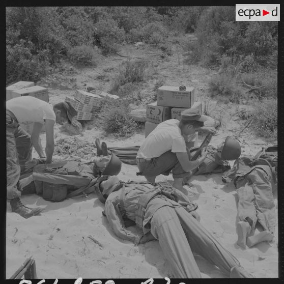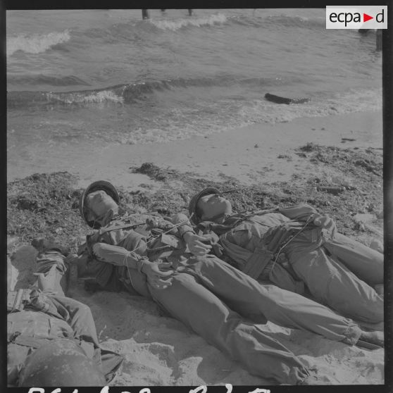 Sur le tournage du film Le jour le plus long. Mannequins sur la plage.