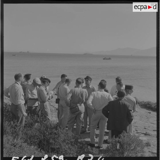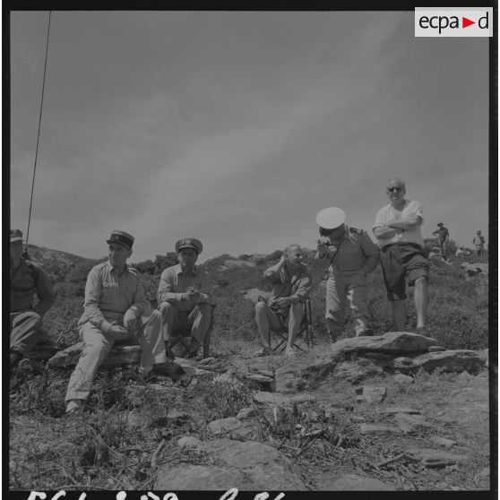 Sur le tournage du film Le jour le plus long. Darryl Zanuck, producteur du film, s'entretient avec les observateurs militaires et le lieutenant-colonel Simon, chef du Service d'information et d'études du ministère des Armées (SIEMA).