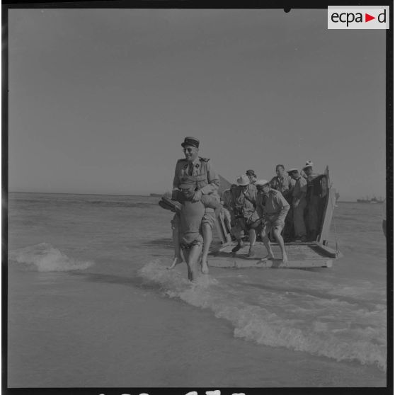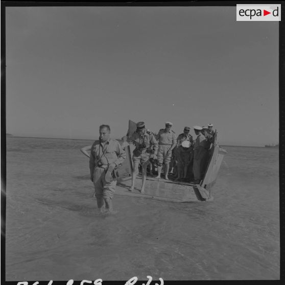 Sur le tournage du film Le jour le plus long. Phase du débarquement des militaires américains du corps des Marines.