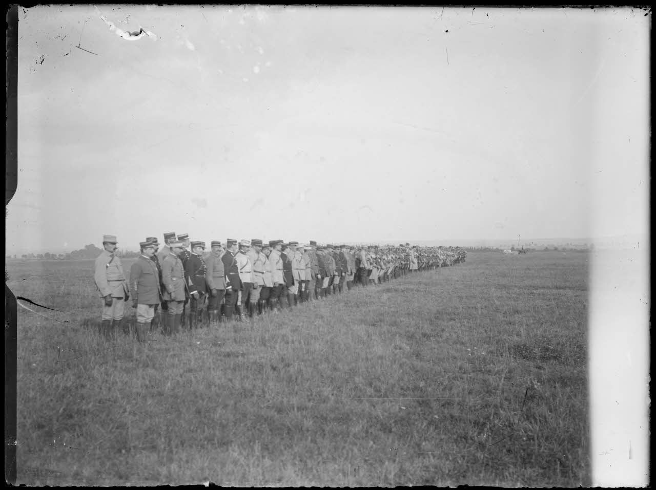 D169-11-14BIS. Le plus éloigné est le sergent Drouet qui va recevoir la médaille militaire. A côté de lui, le capitaine chef du service aéronautique qui doit décorer le récipiendaire. Les autres sont des médaillés militaires.