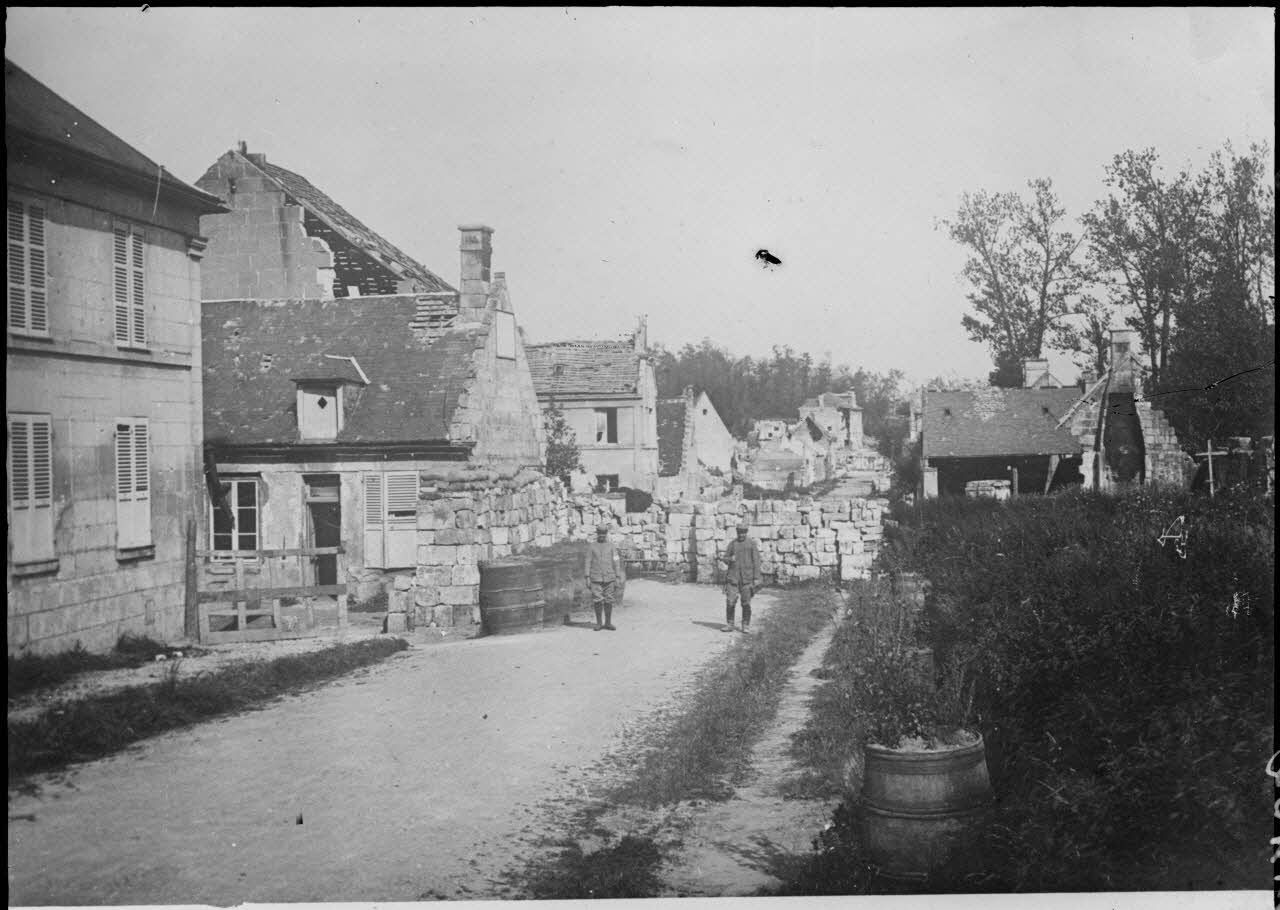 Tracy-le-Val : entrée du village. Le village occupé par nous, le cimetière par les allemands. [légende d’origine]