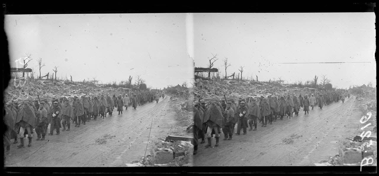 Tracy-le-Val (Oise), détachement de prisonniers traversant les ruines du village.