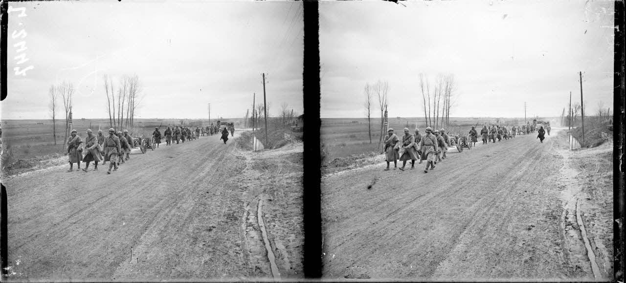 - une colonne d'infanterie en marche sur une route près des tranchées de Calonne (troupes à pied, motorisées et à cheval) ;