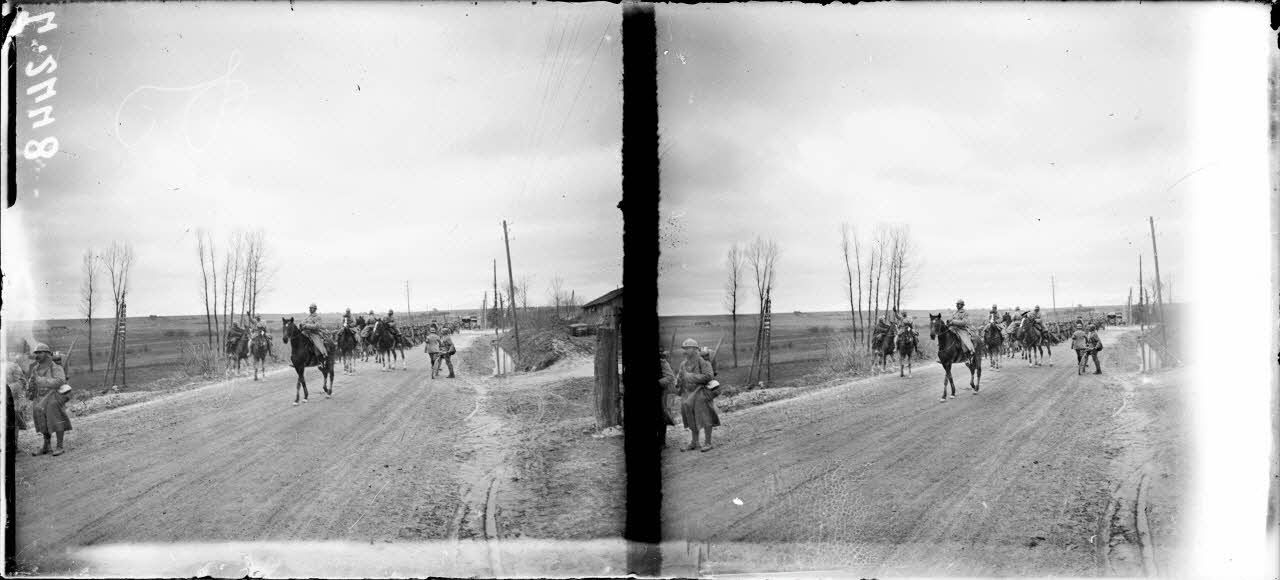- une colonne d'infanterie en marche sur une route près des tranchées de Calonne (troupes à pied, motorisées et à cheval) ;