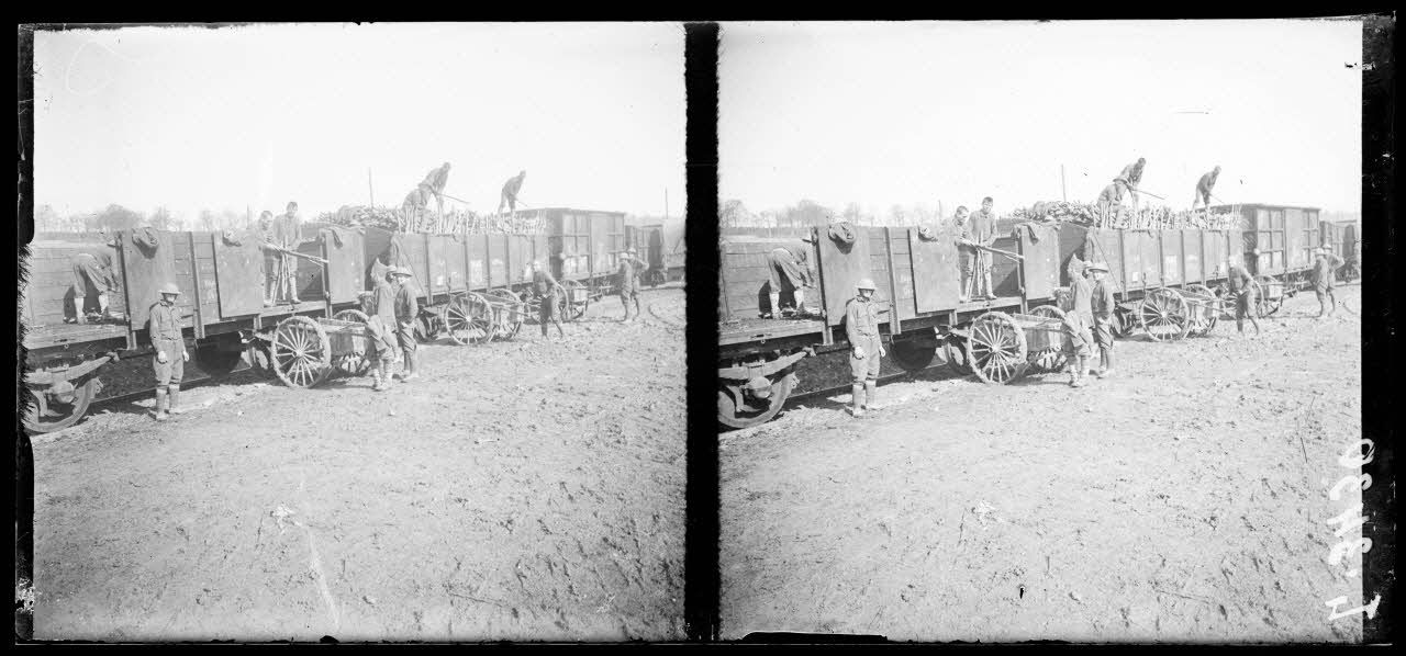 - les tranchées de Calonne (SPA 71 L 3430 à 3433/3437), des soldats américains déchargent du matériel d'un train de chemin de fer, les baraquements, un abri, des soldats américains réceptionnent des caisses de rations de combat (voir en film 14.18 A 1150) ;