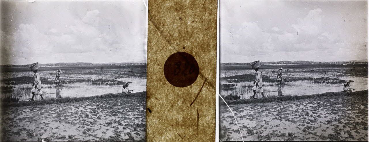 D68-31. Le riz est la nourriture de base à Madagascar. Les terrains favorables étant assez rares, les Malgaches ont recours aux cultures en terrasses. Vers novembre, les hommes labourent la terre à l'aide de leur longue bêche, l'engady. Après la saison des pluies, les femmes viennent repiquer une à une les pousses dans les rizières inondées. La récolte puis le battage des gerbes ont lieu en mars.