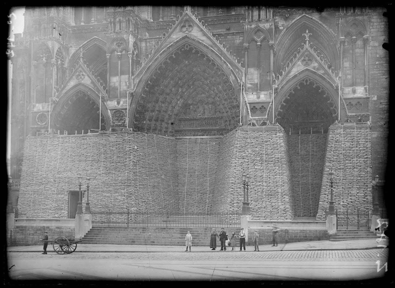 A Amiens, (Somme, Z142), des travaux visant à protéger la cathédrale sont entrepris par l'armée. Des sacs de sables sont entassés devant le monument.