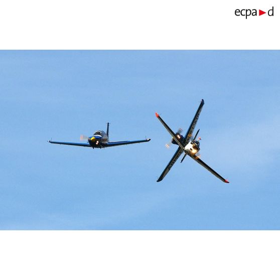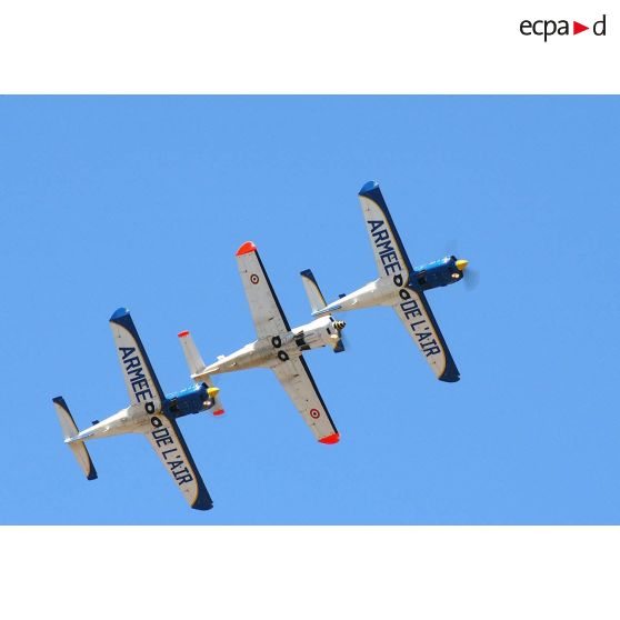Trois avions d'entraînement Socata TB-30 Epsilon du Groupement Ecole 315 (Ecole de pilotage de l'armée de l'Air EPAA 315) durant la démonstration en vol.