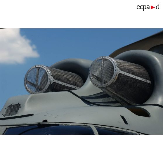 Lors du meeting aérien de l'ALAT au Luc en Provence, gros plan sur les turbines de l'hélicoptère AS332 Super Puma SA-330 de l'armée suisse.