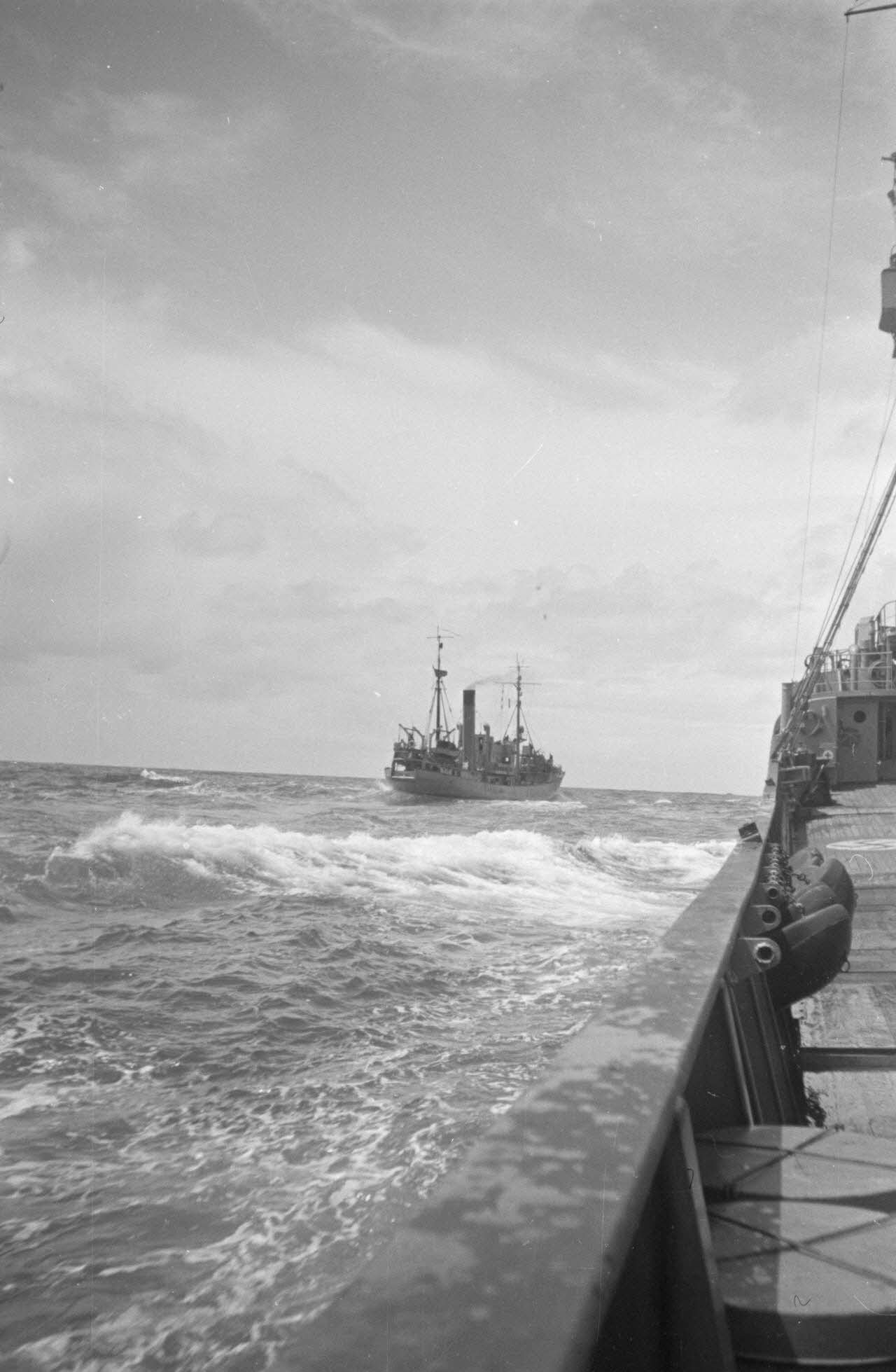 Depuis un dragueur de mines (Minensuchboot), un marin allemand récupère une bouée de sauvetage tombée à la mer.