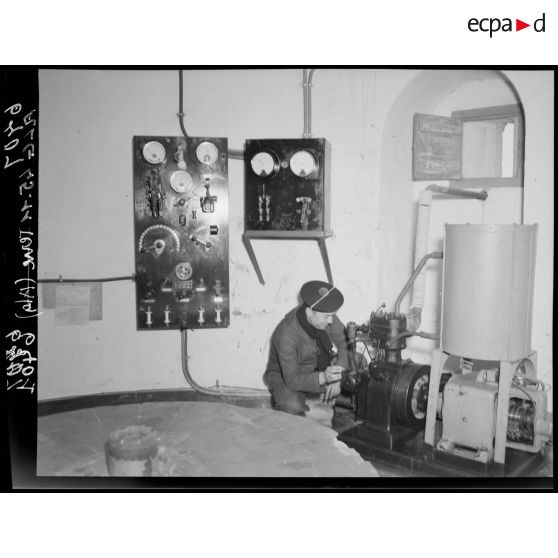 Un marin effectue la vérification et l'entretien du groupe électrogène, à l'interieur d'un sémaphore.