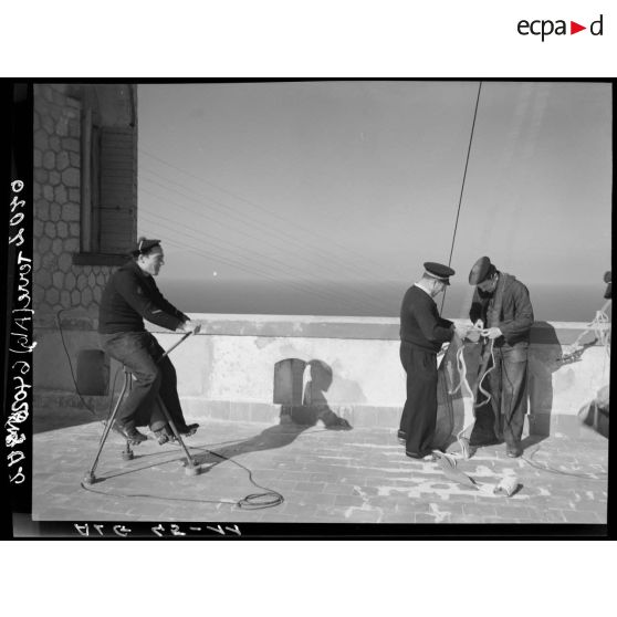 Trois marins identifient et réparent une panne de courant ; l'un d'eux sur un pédalier électrique, sur la terrasse d'un sémaphore, face à la mer.