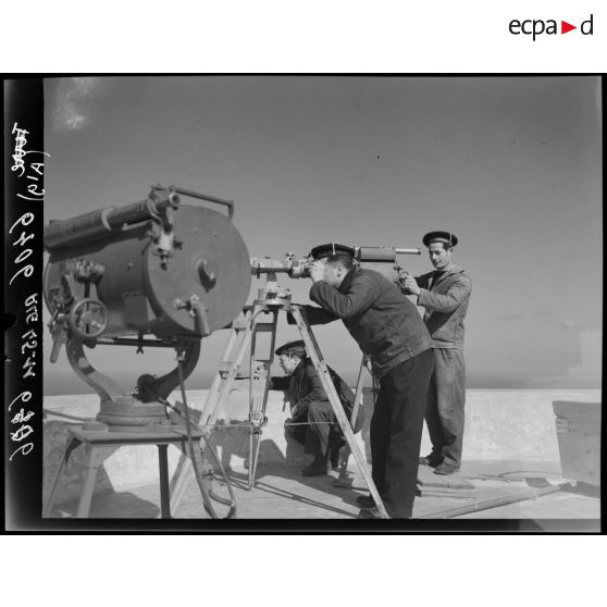 Trois marins interprètent des signaux d'un bâtiment, à l'aide d'un projecteur et de jumelles sur trepied, sur la terrasse d'un sémaphore, face à la mer.