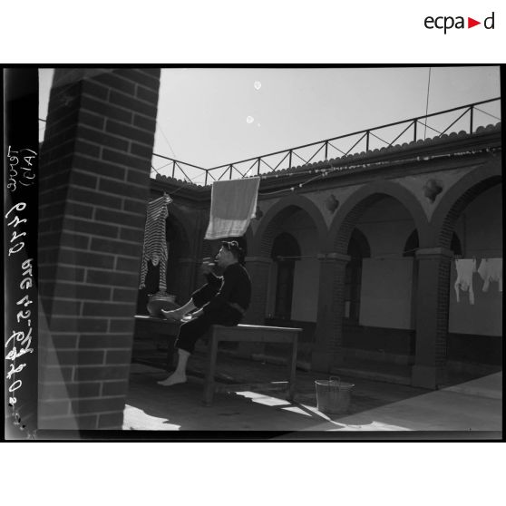 Un marin assis sur un banc, de profil, fume une cigarette, en attendant l'heure du repas, dans la cour d'un sémaphore, où sèche du linge.