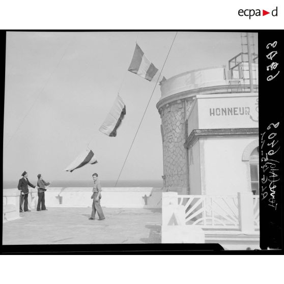 Trois marins, dont le chef de poste, effectuent une transmission par pavillon et projecteur, sur la terrasse d'un sémaphore, face à la mer.