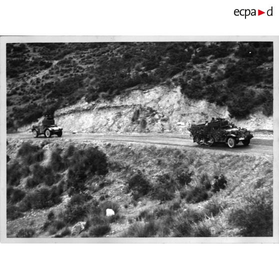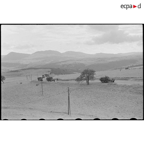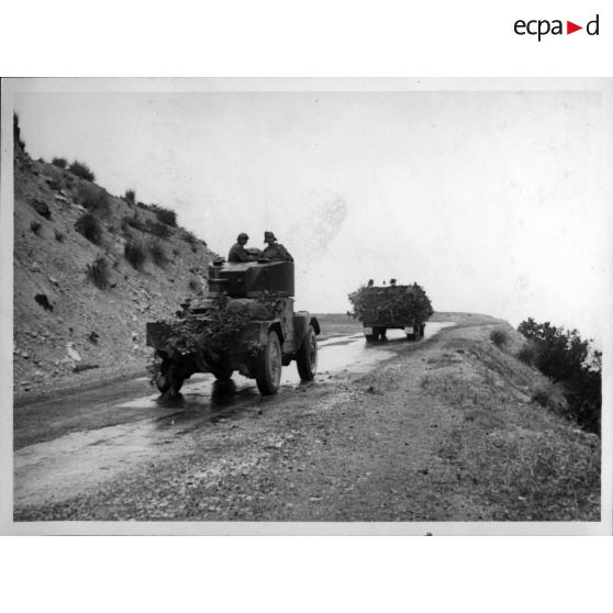 Transport de troupes à bord d'half-tracks sur la route de Mouzaïaville.