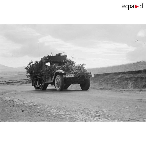 Un half-track camouflé sous du feuillage, roule sur une route de la région de Mouzaïaville.