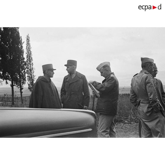 Un général de brigade et un officier regardent une carte sur le toit d'une traction au bord d'une route de la région de Mouzaïaville.
