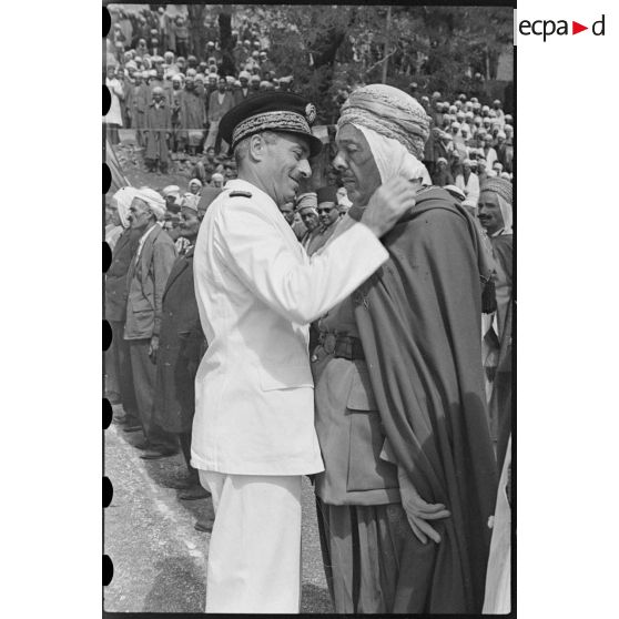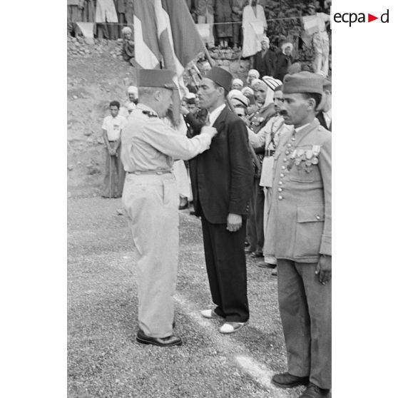 Le général Olleris, commandant la 10e région militaire (RM), remet une décoration à un ancien combattant lors d'une cérémonie à Mouzaïaville.