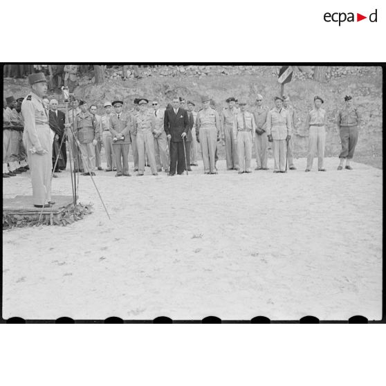 Le général Olleris, commandant la 10e région militaire (RM), fait un discours lors d'une cérémonie à Mouzaïaville.