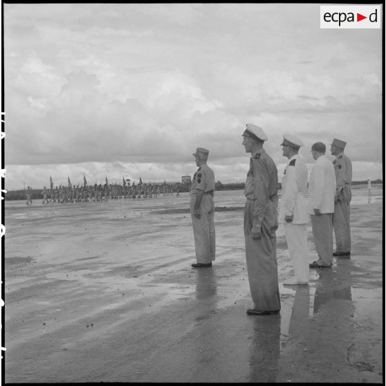 Sur un aérodrome d'Hanoï, les autorités militaires et civiles regardent défiler les troupes du CEFEO (Corps expéditionnaire français en Extrême-Orient).