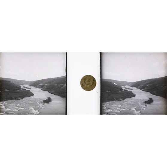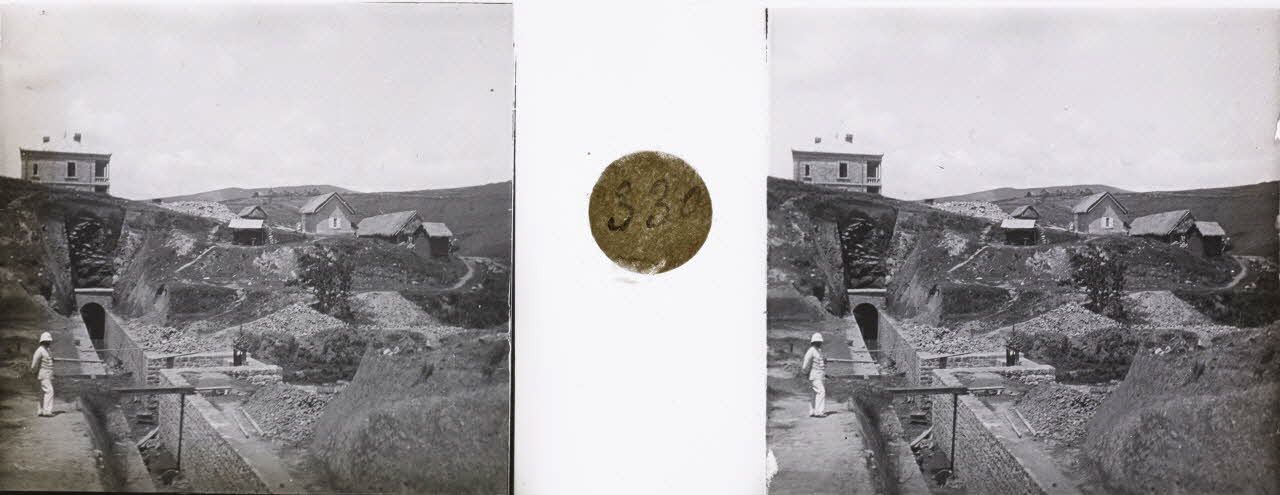 D68-32. René Denis photographie les paysages naturels malgaches lors de ses expéditions cartographiques dans la vallée de la Mandraka à l'est de Manjakandriana. Il circule alors avec deux tirailleurs et deux équipes de quatre bourjanes. Il photographie également le barrage d'Antelomito et son usine hydro-électrique.