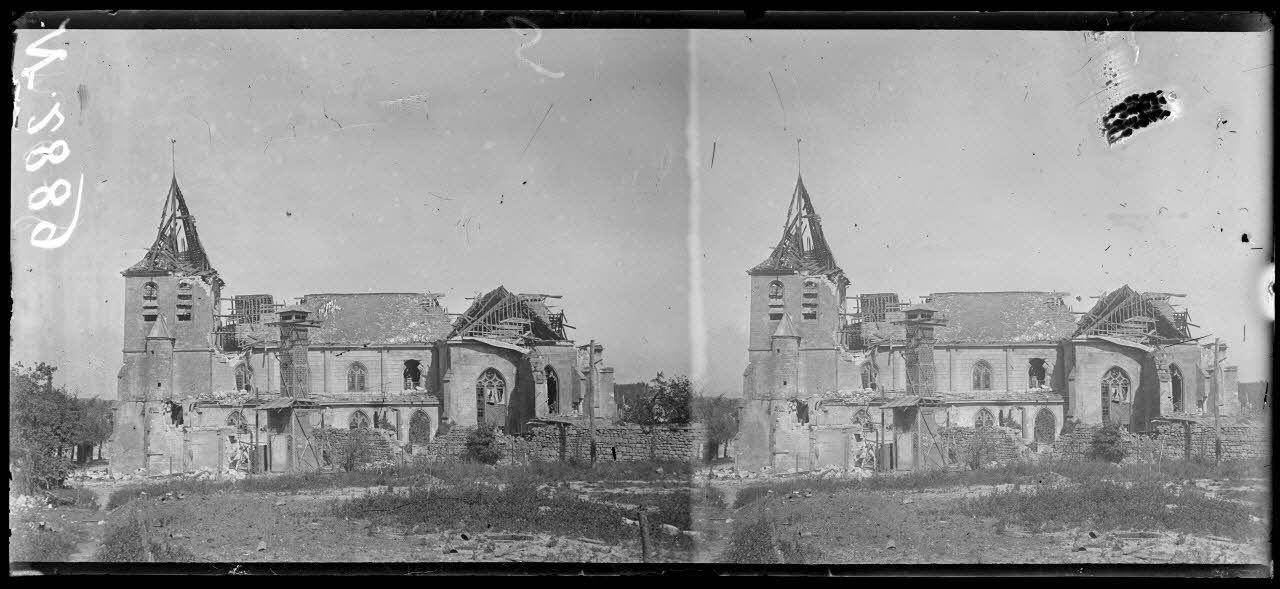 Dans l’Aisne, à Morsain, un poste de secours accueille les blessés qui sont évacués sur brancards en camion sanitaire, et à l’arrière d’un camion de transport pour ceux qui peuvent marcher ; les machines agricoles sont rendues inutilisables, l’église et le village sont détruits, seul le château tient encore debout ; un convoi de prisonniers allemands circule, officiers en tête. Dans Chevillecourt, quasiment rasé, un convoi hippomobile traverse les ruines en soulevant de la poussière. A Trosly-Loire, l’église est jonchée de gravats, la toiture crevée et les vitraux soufflés. L’église de Guny n’a plus de toit. A Coucy, le château a été bombardé et ses abords ne sont plus qu’un amoncellement de pierres et de moellons ; les Allemands ont construit une barricade à l’entrée du village avec les pierres d’une tour médiévale. Un convoi d’artillerie traverse les ruines de Juvigny. A Soissons, une barricade édifiée par l’ennemi barre encore le pont des Anglais du côté du faubourg Saint-Waast ; la toiture de la cathédrale s’est écroulée dans la nef, tandis que la façade de Saint-Jean-des-Vignes demeure intacte.