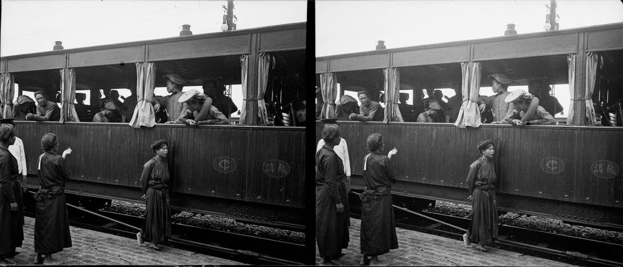 Troubles d'Annam. Avril 1908. Embarquement de la 1re cie du 1er régiment de t t à Hanoï, à destination de . 1366. En wagon.