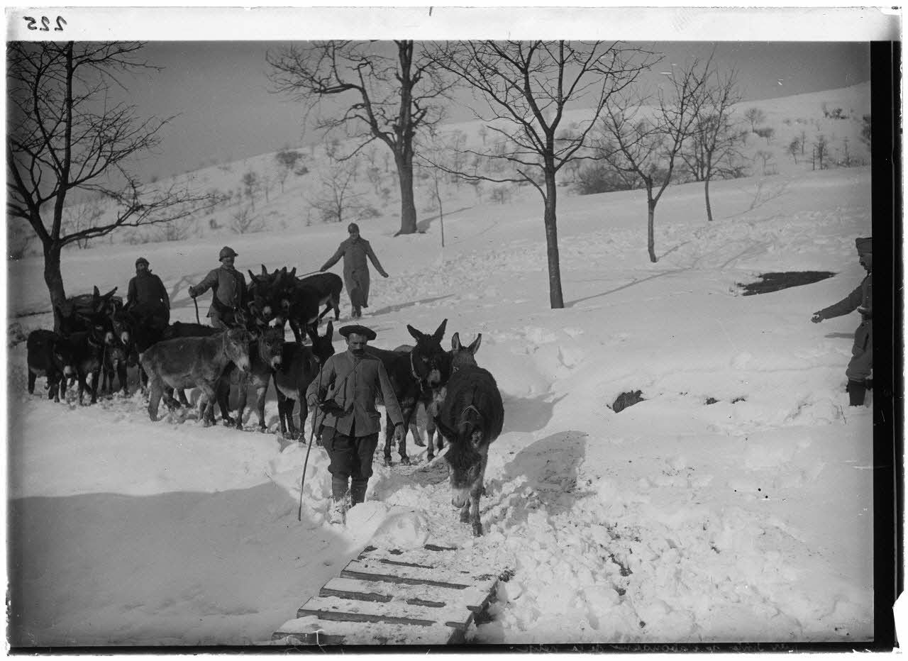 Colonne muletière transportant du matériel de tranchées à l'Hartmann. Alsace, 1917.