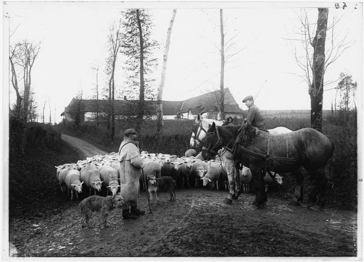 [Troupeau de moutons et son berger sur une route de campagne.]