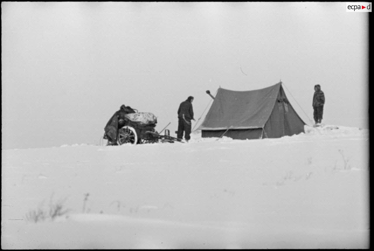 Un abri de fortune dans une tente équipée d'un poêle, une remorque (Infanteriekarren) est recouverte de neige.