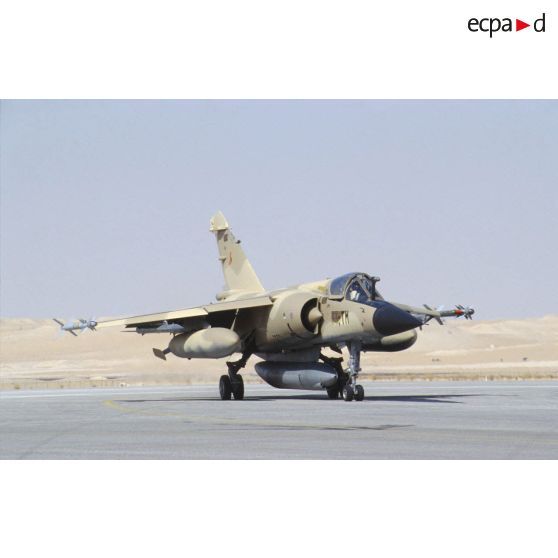Un avion de combat Mirage F1-CR de l'ER (escadron de reconnaissance) 2/33 Savoie (cocotte), armé de missiles Matra R-550 Magic II en bout d'ailes, s'avance sur la piste de la BA (base aérienne) d'Al Ahsa.