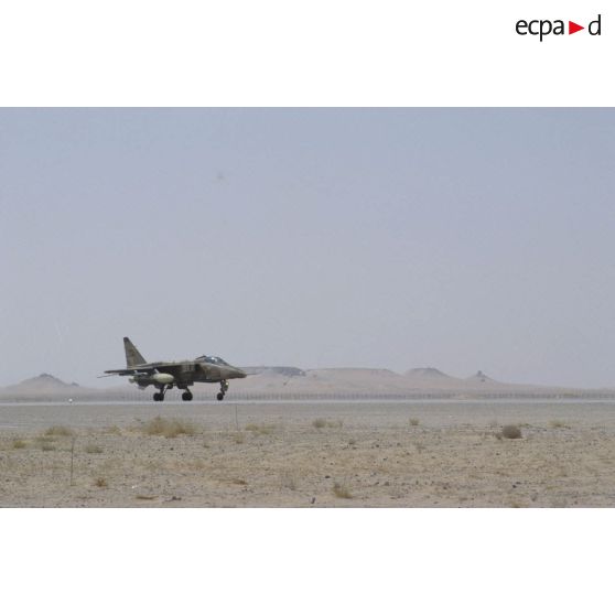 Un avion de combat Mirage F1-CR, armé de missiles Matra R-550 Magic II en bout d'ailes s'avance sur la piste de la BA (base aérienne) d'Al Ahsa. Le sergent photographe au 2/33 Savoie.